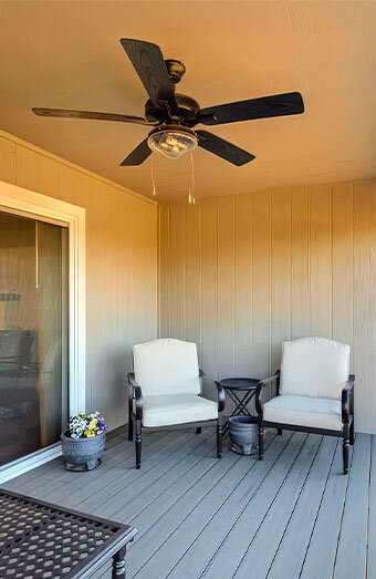 Professional installation of IP-rated weatherproof ceiling fans for patios, decks, and verandas, designed to withstand humidity and weather elements.